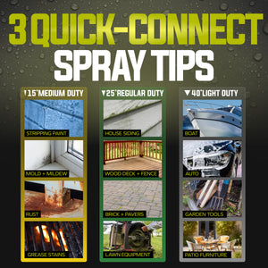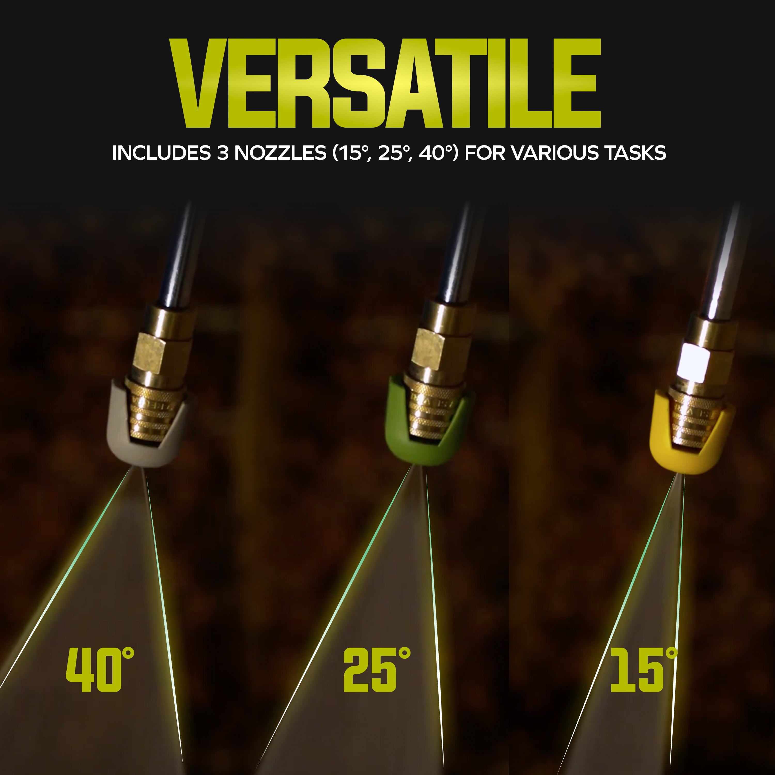 - VERSATILE PERFORMANCE: Tackle a range of cleaning tasks with three quick-connect spray nozzles (15°, 25°, 40°) for customizable pressure