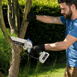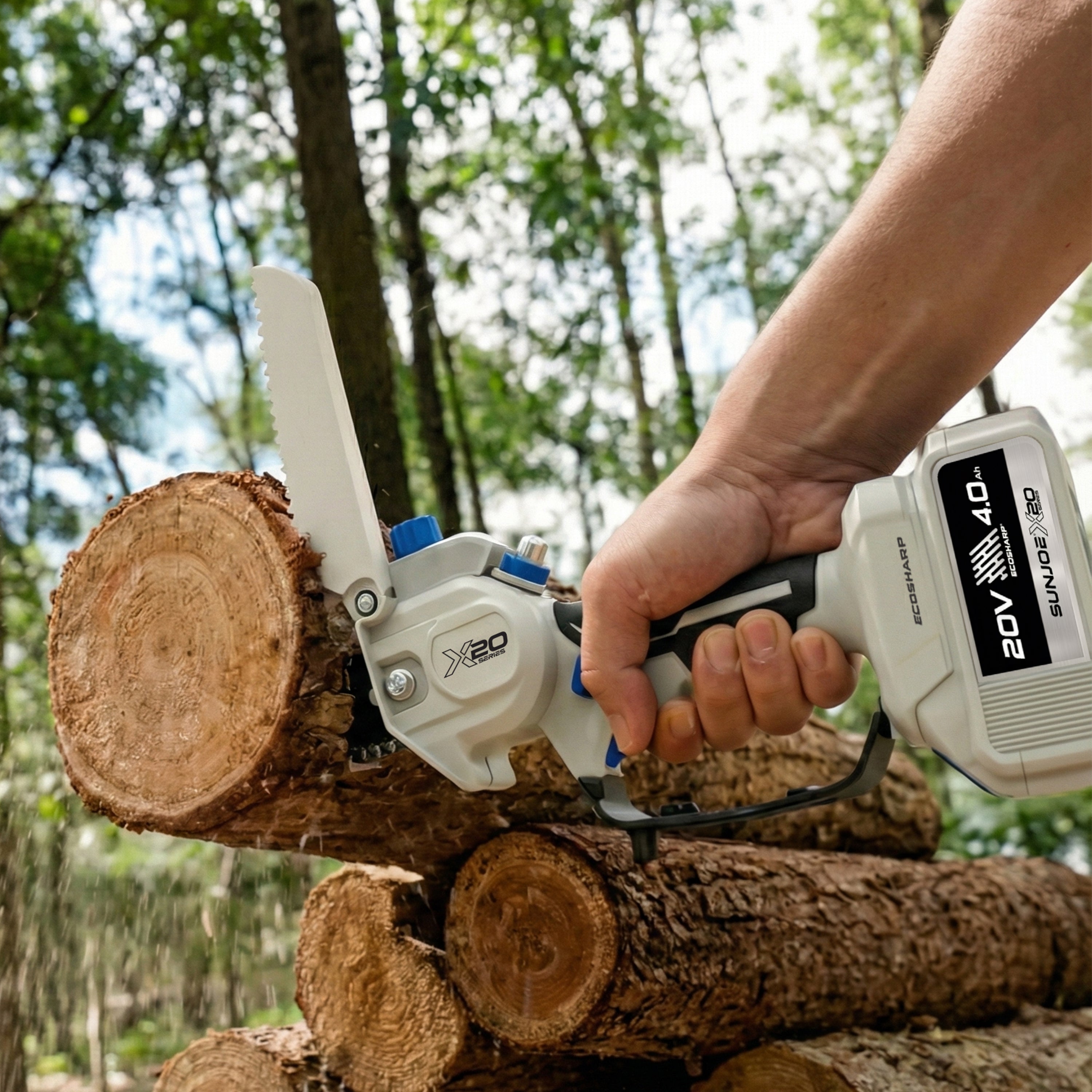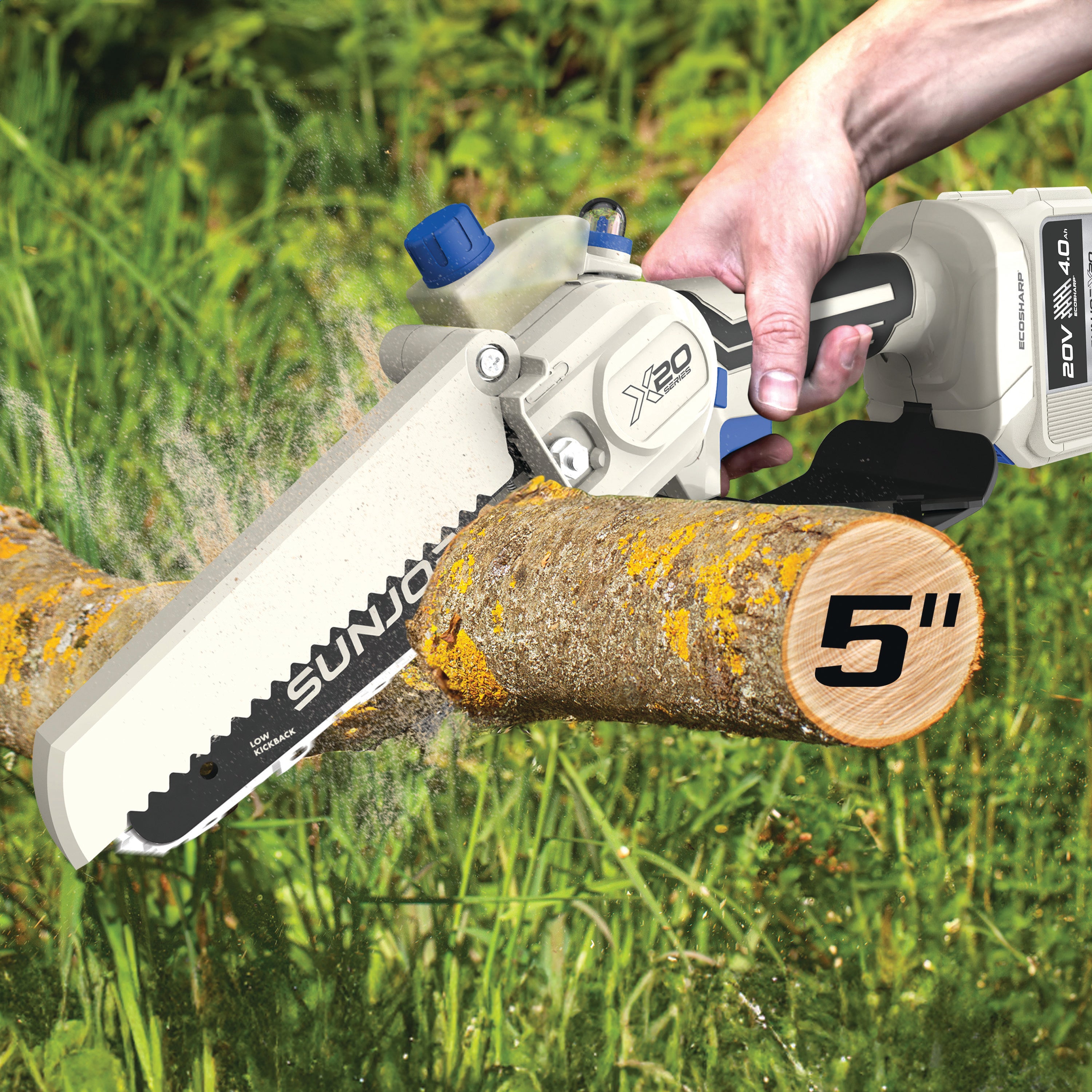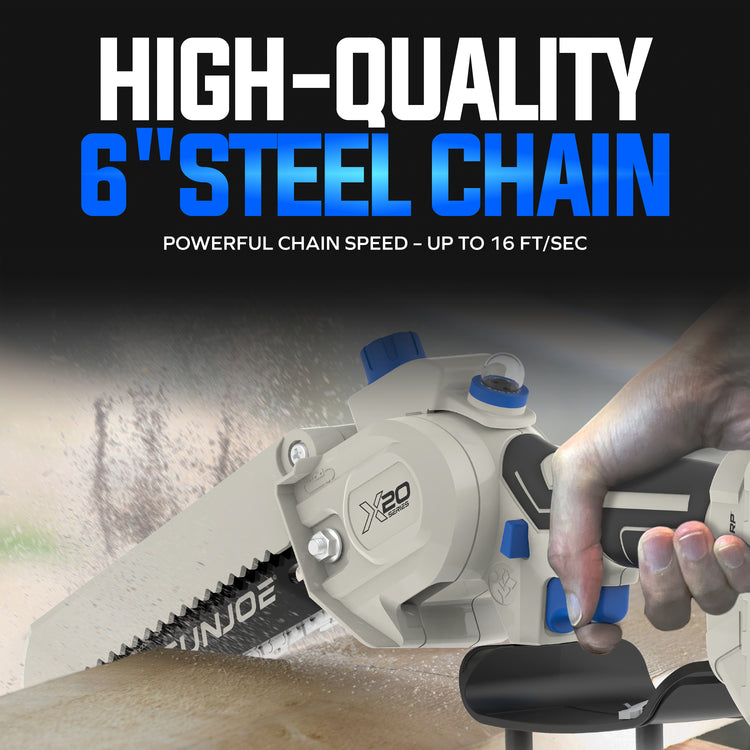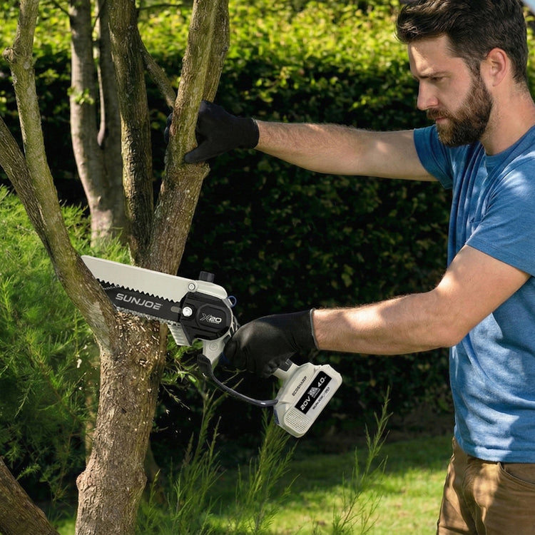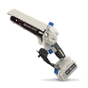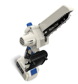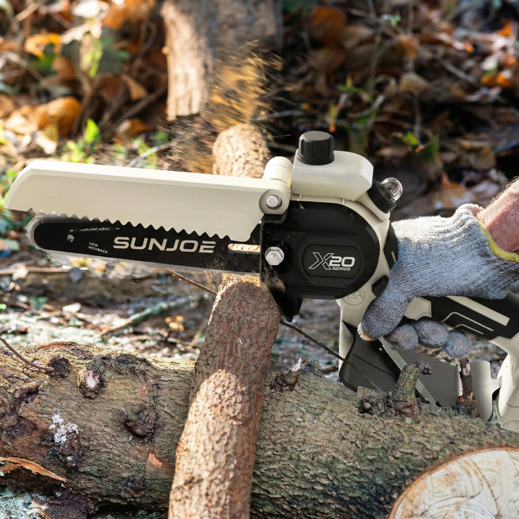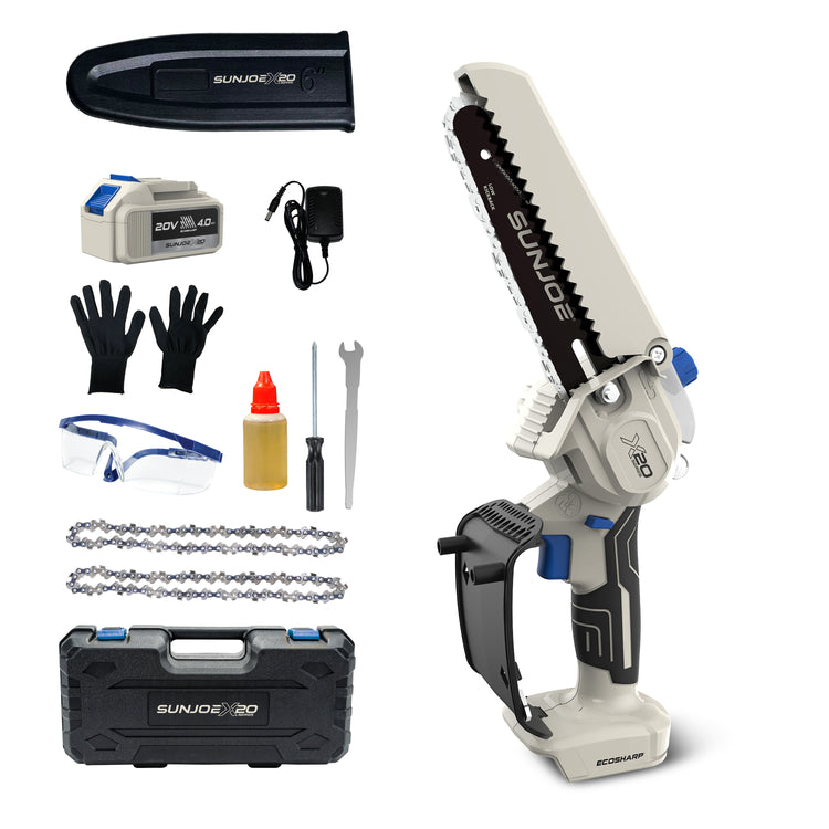 SEE IT? SAW IT! Trim overgrown trees, shape shrubs, and cut kindling with the lightweight and compact Sun Joe® GO pruning chainsaw. With cordless convenience and a 20V ECOSHARP® rechargeable battery on board, this handheld chainsaw easily goes beyond the porch and patio to tackle your outdoor to-do list. Weighing in at under 4 lbs (your handbag is probably heavier!), its generous 6"L saw blade, coupled with one-handed operation, make it easy to trim, saw, cut, and prune -- just squeeze the trigger to slice through branches, logs, and thick thatch in your yard, garden, or garage. This handy hero makes storm cleanup, home improvements (new deck alert!), fall firewood, and landscape maintenance manageable -- without the hassle of extension cords or gas spills.