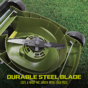 - POWERFUL: Perfect for small to medium lawns, battery-powered mower's durable steel blade cuts a crisp 14" wide path with precision in a single pass