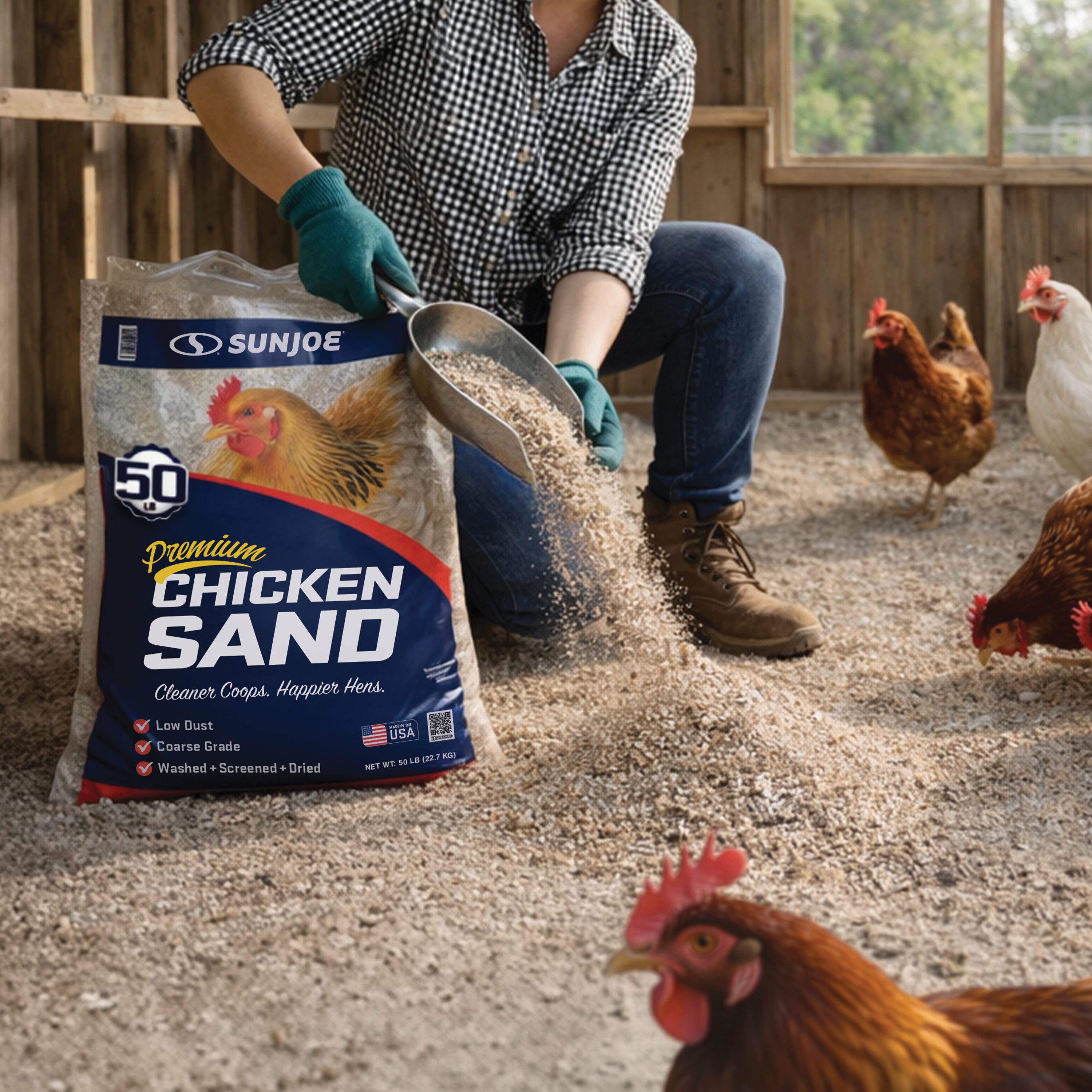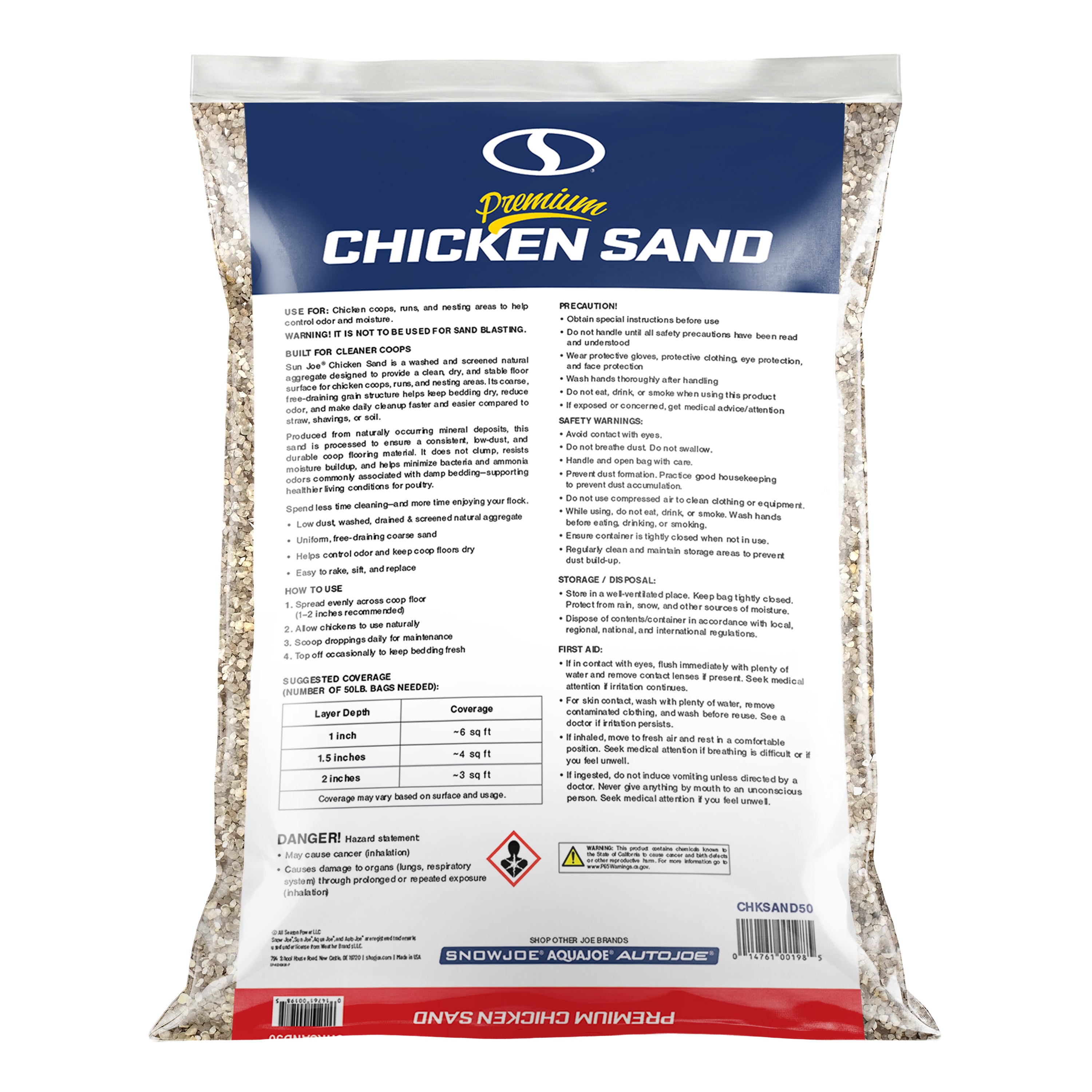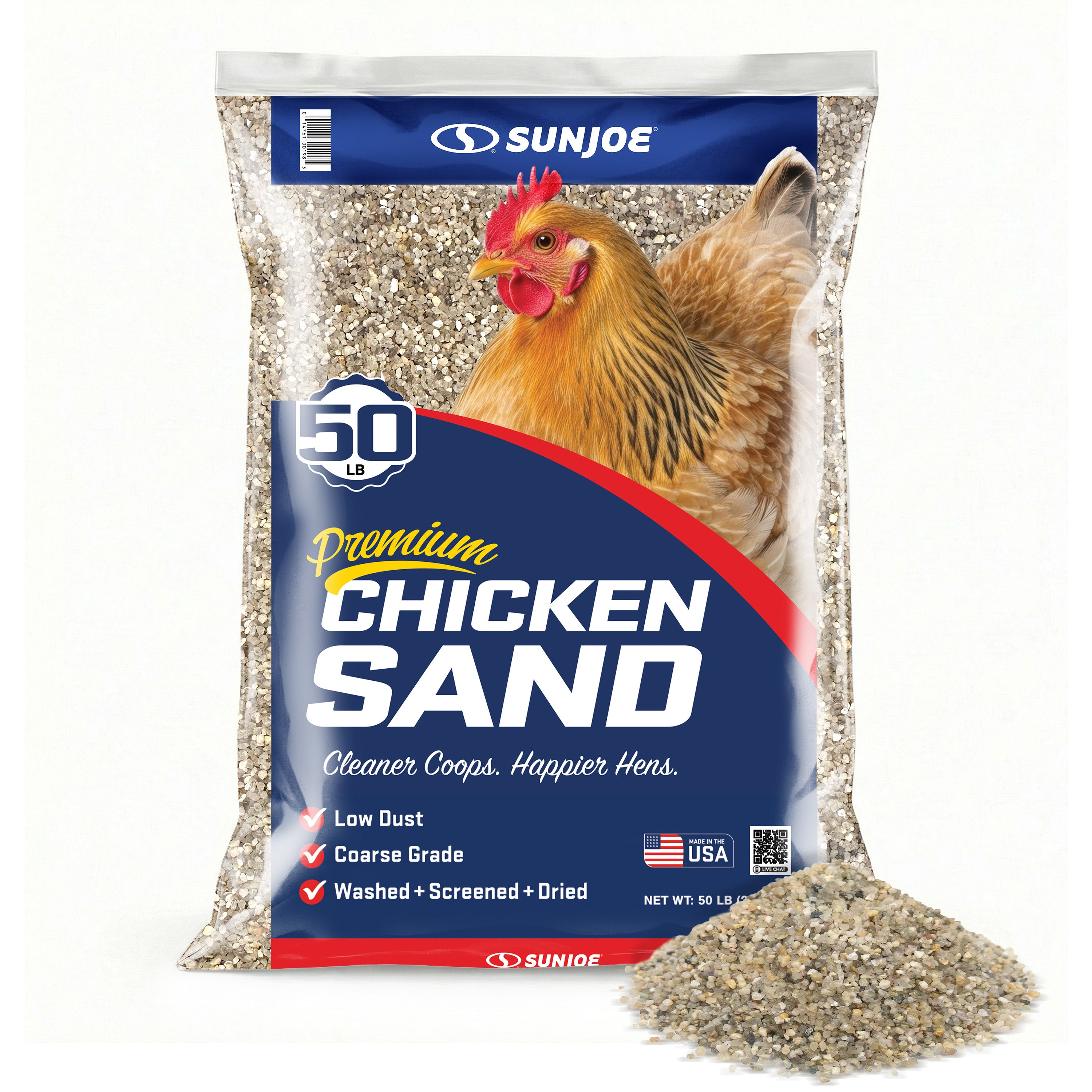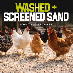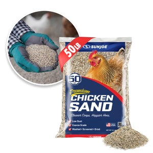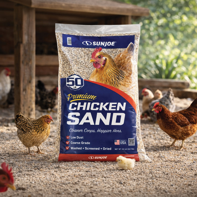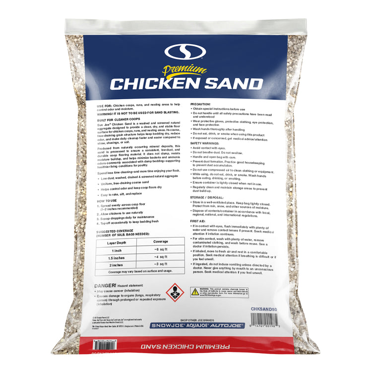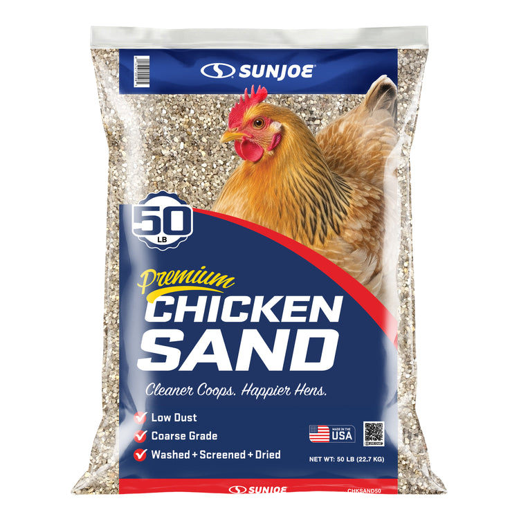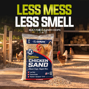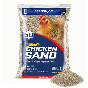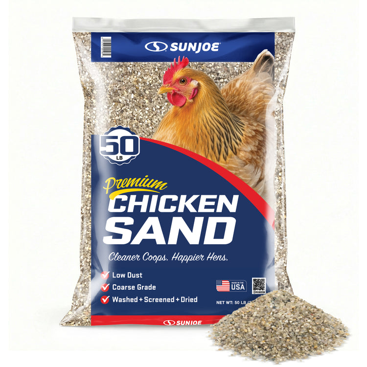 Create a cleaner, healthier home for your flock with Sun Joe® CHKSAND50 Chicken Coop Sand. This premium, naturally sourced sand is washed, screened, and dried to deliver a clean, dry, and stable floor surface for chicken coops, runs, and nesting areas. Specially processed from natural mineral deposits near Mauricetown, NJ, its free-flowing, low-dust grain structure resists moisture, controls odor, and makes daily cleanup faster and easier than straw, shavings, or soil. Formulated with 50% finer grain for added comfort underfoot, it helps prevent ammonia buildup, minimize bacteria growth, and reduce the risk of silicosis — supporting longer, healthier lives for your chickens. Whether lining a backyard coop, refreshing a nesting area, or upgrading a poultry run, this 50 lb. bag of premium coop sand delivers consistent performance and peace of mind. Not for sandblasting or construction use. Store in a dry area to maintain freshness. Give your flock the clean, comfortable foundation they deserve with Sun Joe® Chicken Coop Sand.