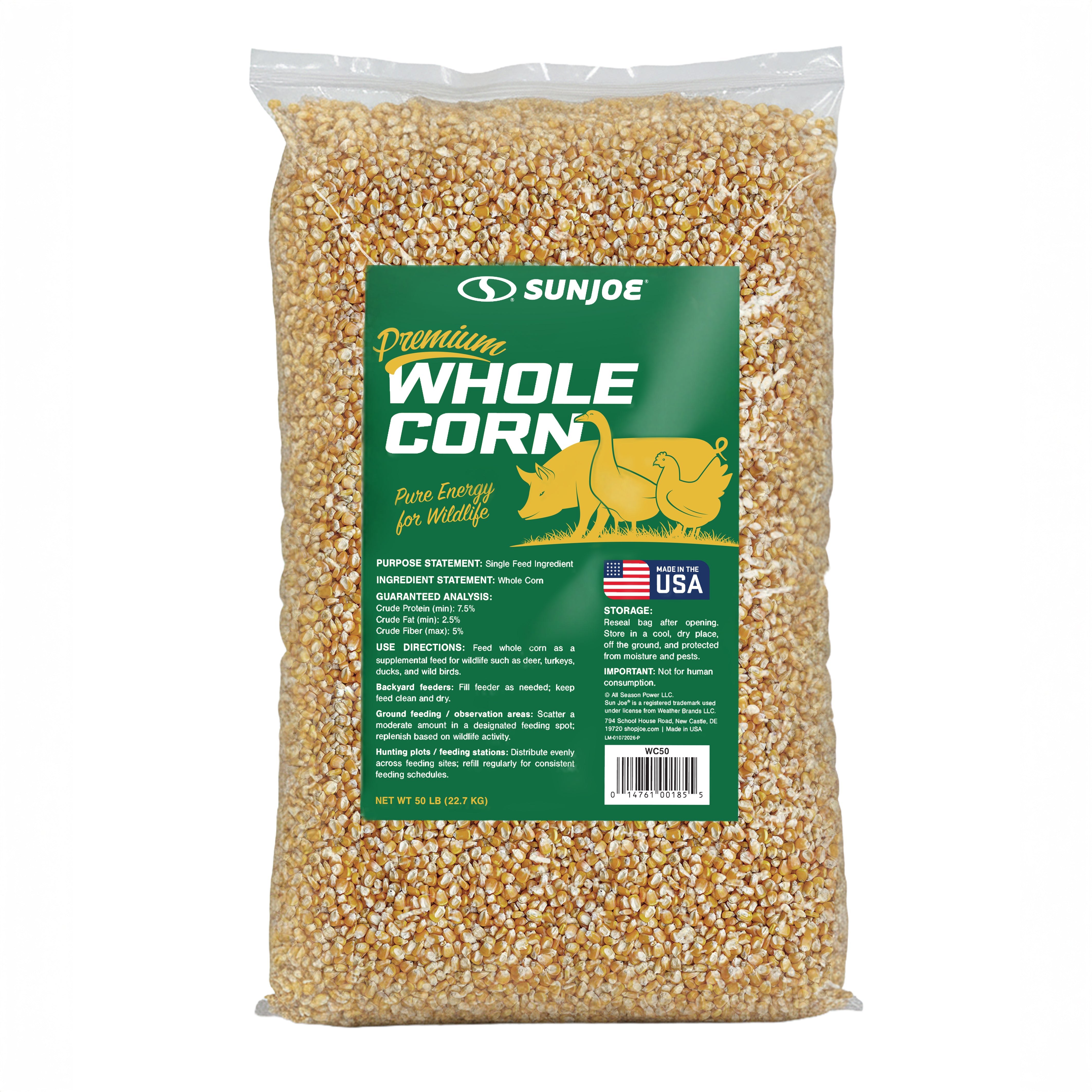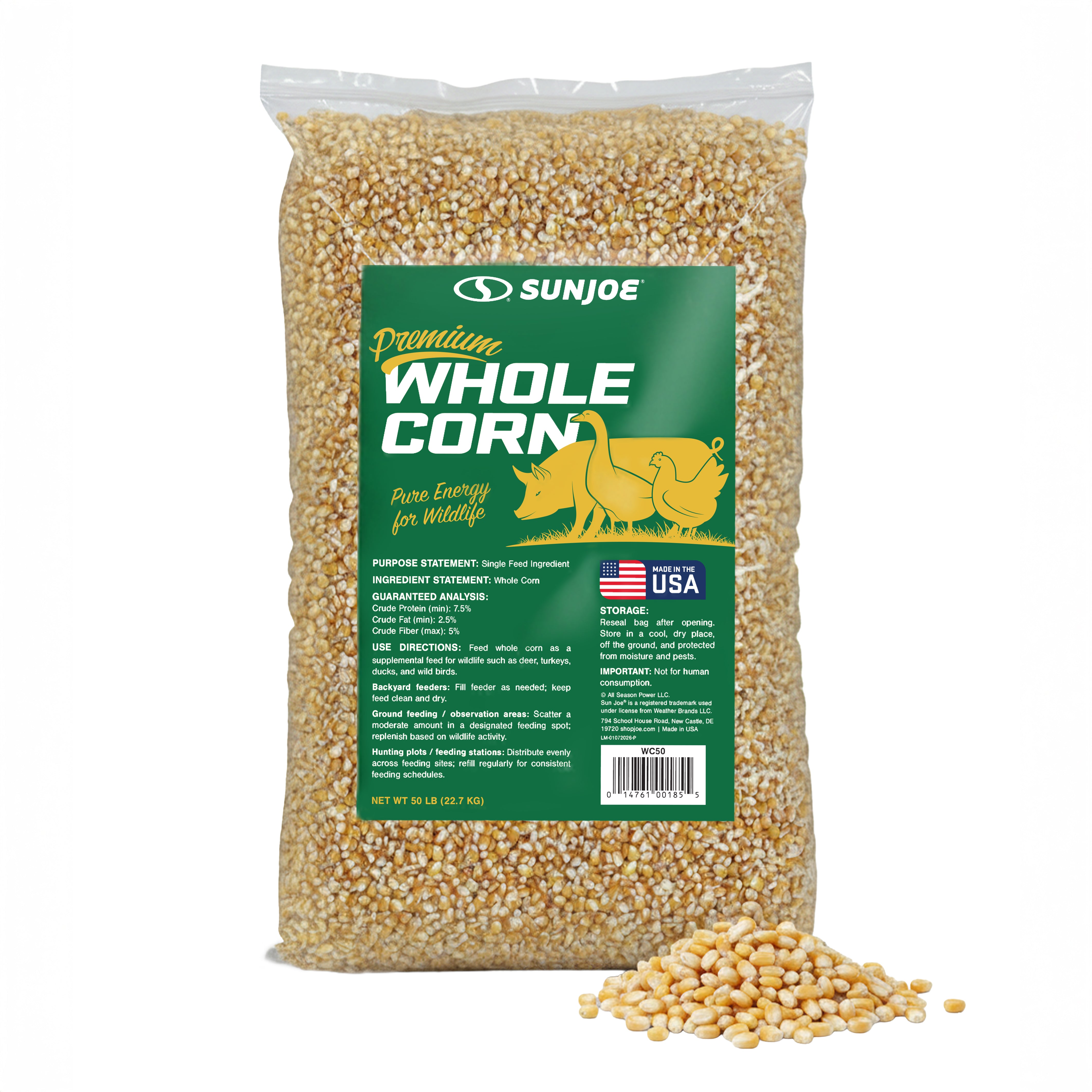 Sun Joe Premium Whole Corn | All Season Feed for Wildlife | Hand-harvested by U.S. Farms. | 50-Lb. Bag