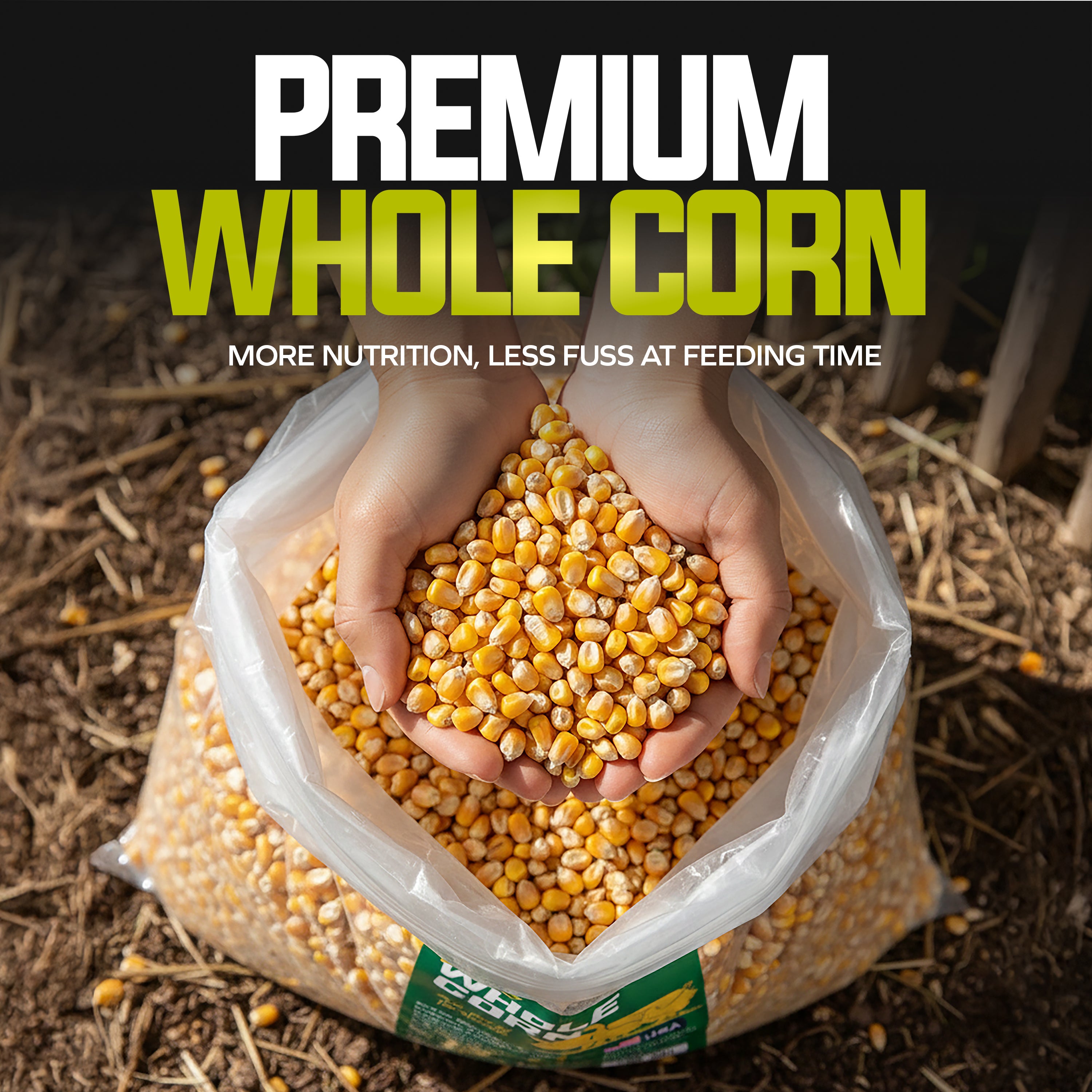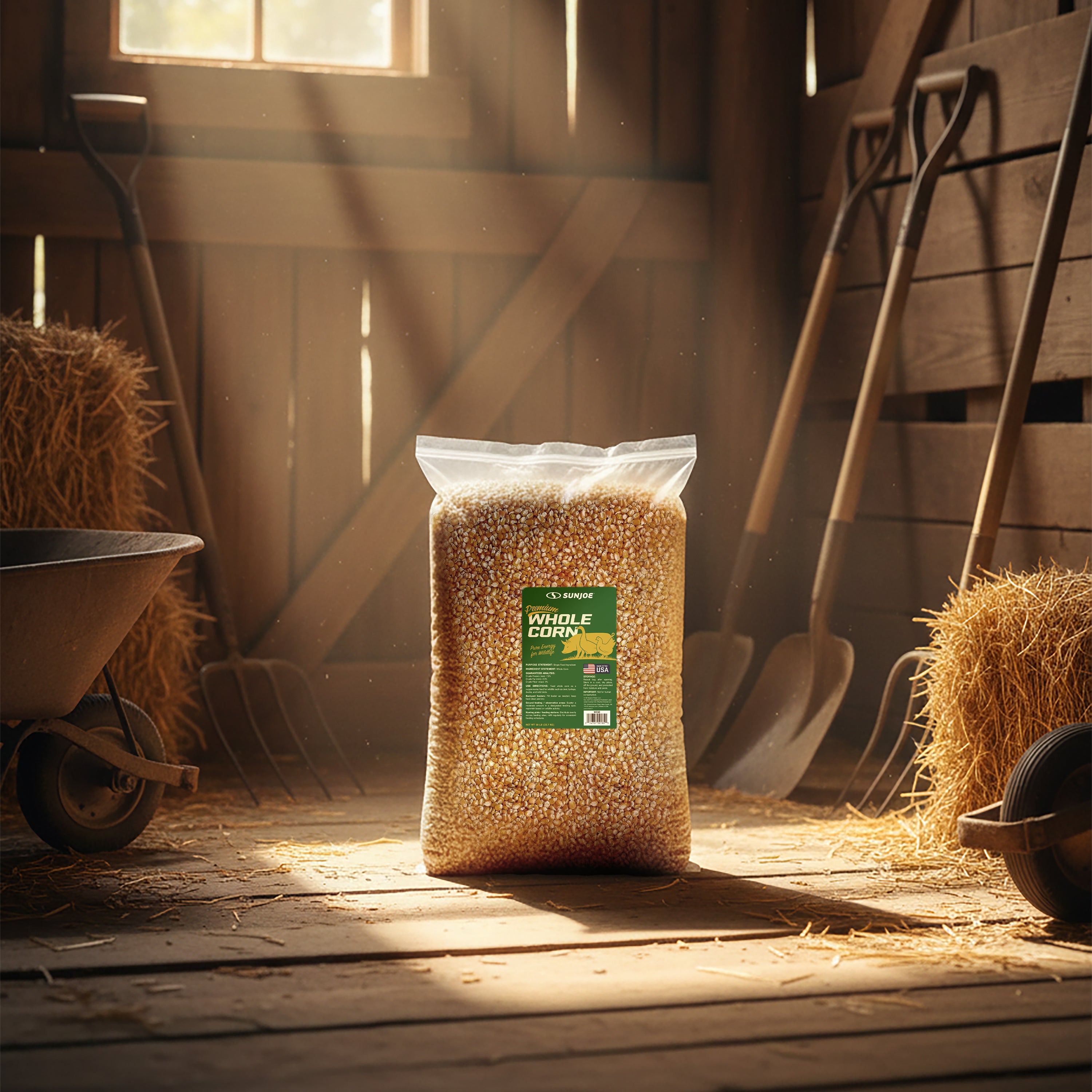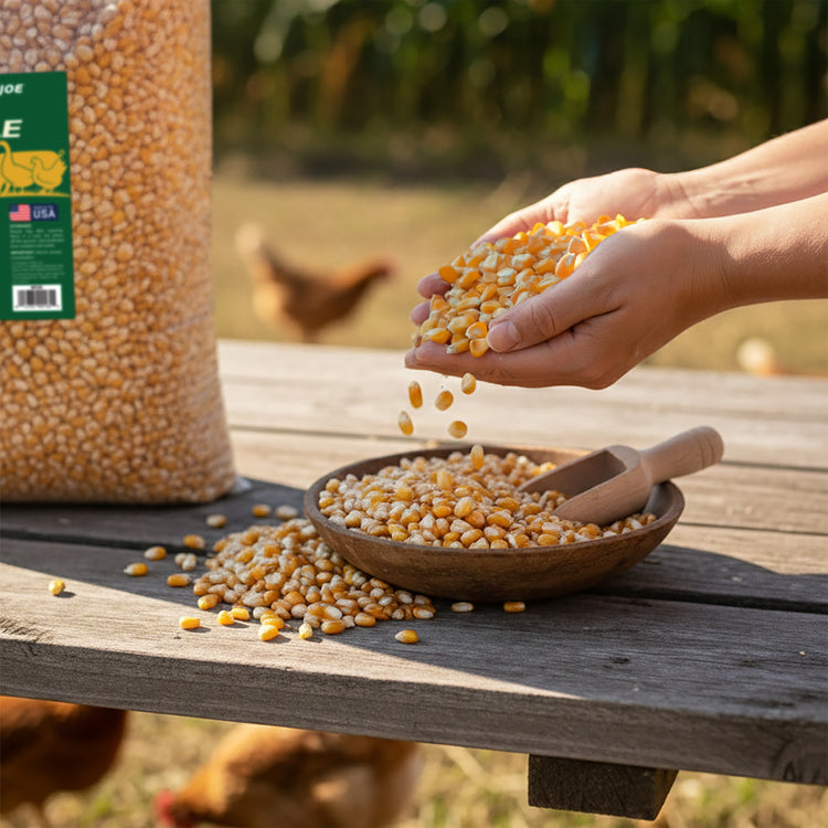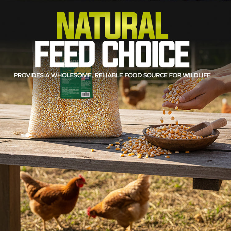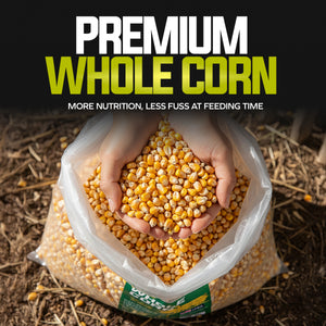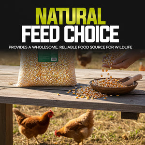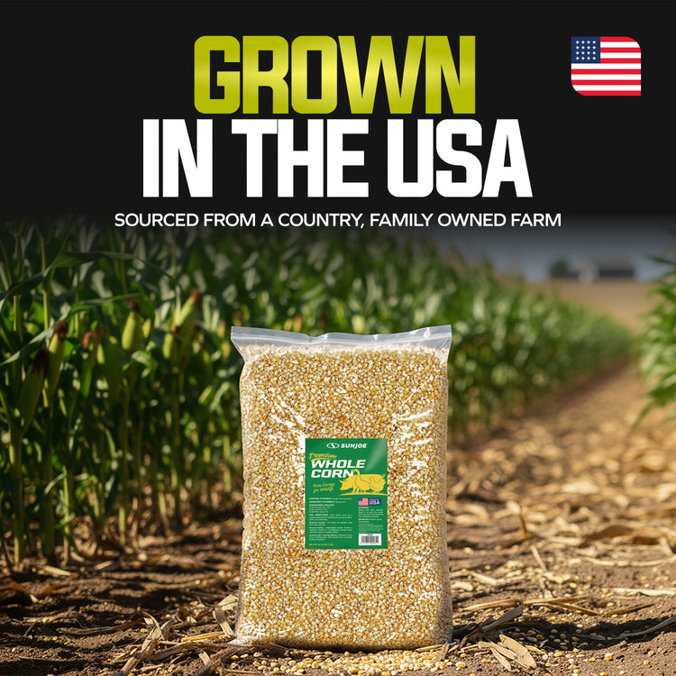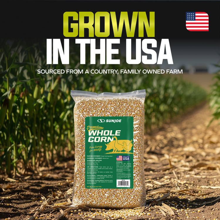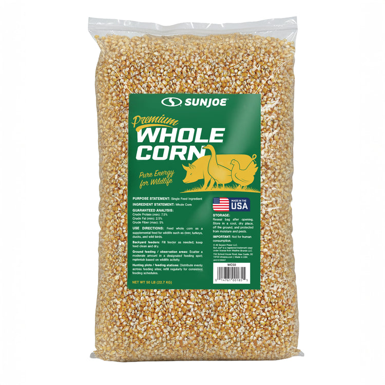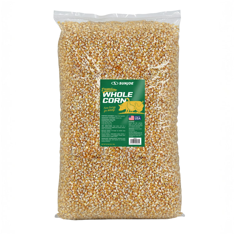 Pure Energy for Poultry and Wildlife. Sun Joe Premium Whole Corn delivers pure, single-ingredient nutrition that's perfect for both backyard poultry and wildlife feeding. Made from 100% whole corn that's been washed, screened, and kiln-dried for superior quality, this premium feed provides natural, wholesome energy to support the daily needs of chickens, deer, birds, squirrels, and other wildlife throughout the year. The careful processing ensures low dust content and moisture resistance, making it easy to handle, store, and clean up after feeding. Packed with natural carbohydrates, this high-energy feed helps sustain activity levels and provides essential nutrition during colder months or high-activity seasons. Whether you're using gravity feeders, troughs, or designated ground feeding areas, whole corn offers a simple, reliable solution for daily feeding routines. Perfect for poultry keepers and wildlife enthusiasts who want consistent, wholesome nutrition their animals can count on.