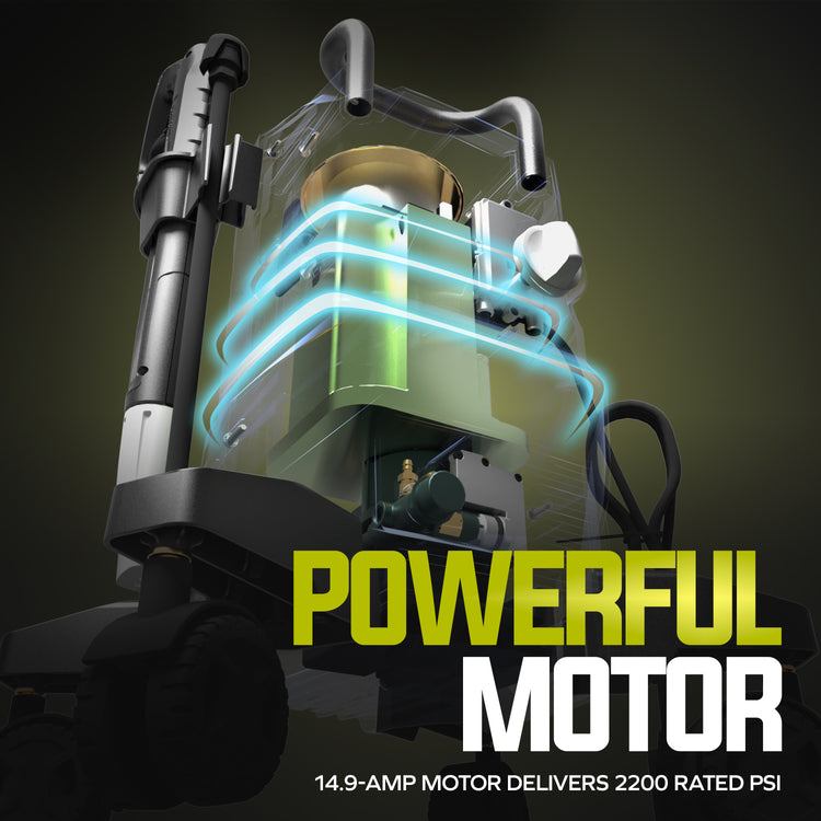 - POWERFUL CLEANING: 14.9-amp motor delivers up to 2200 PSI and 1.1 GPM for effective removal of dirt, grime, mildew, and grease on driveways, decks, siding, and more