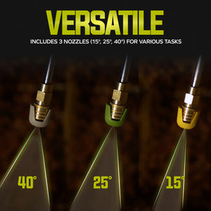 - VERSATILE PERFORMANCE: Tackle a range of cleaning tasks with three quick-connect spray nozzles (15°, 25°, 40°) for customizable pressure