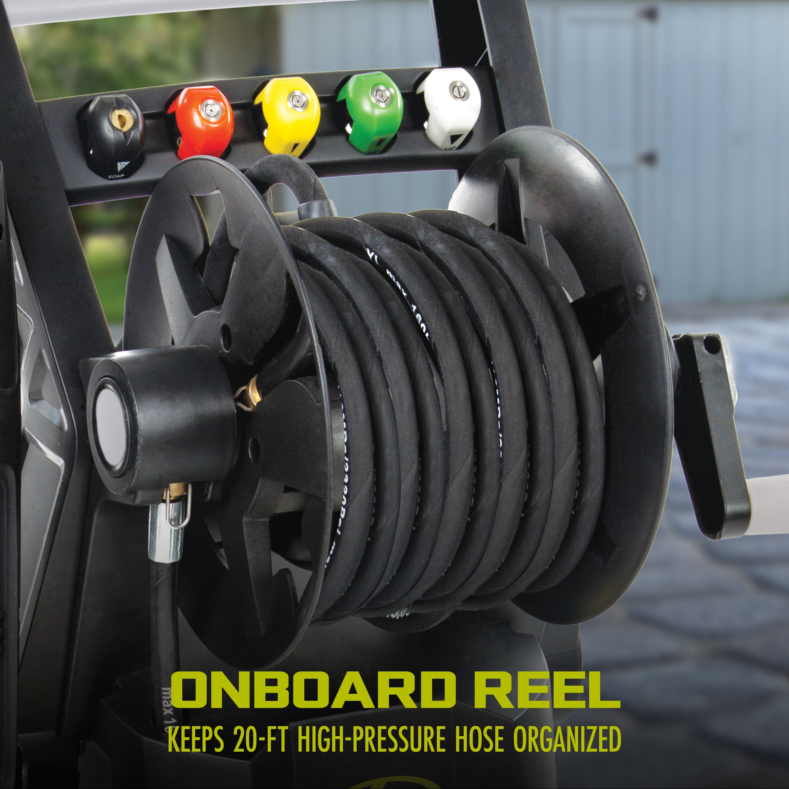 - HOSE REEL: Onboard reel keeps 20 ft high-pressure hose neat and tangle-free