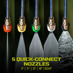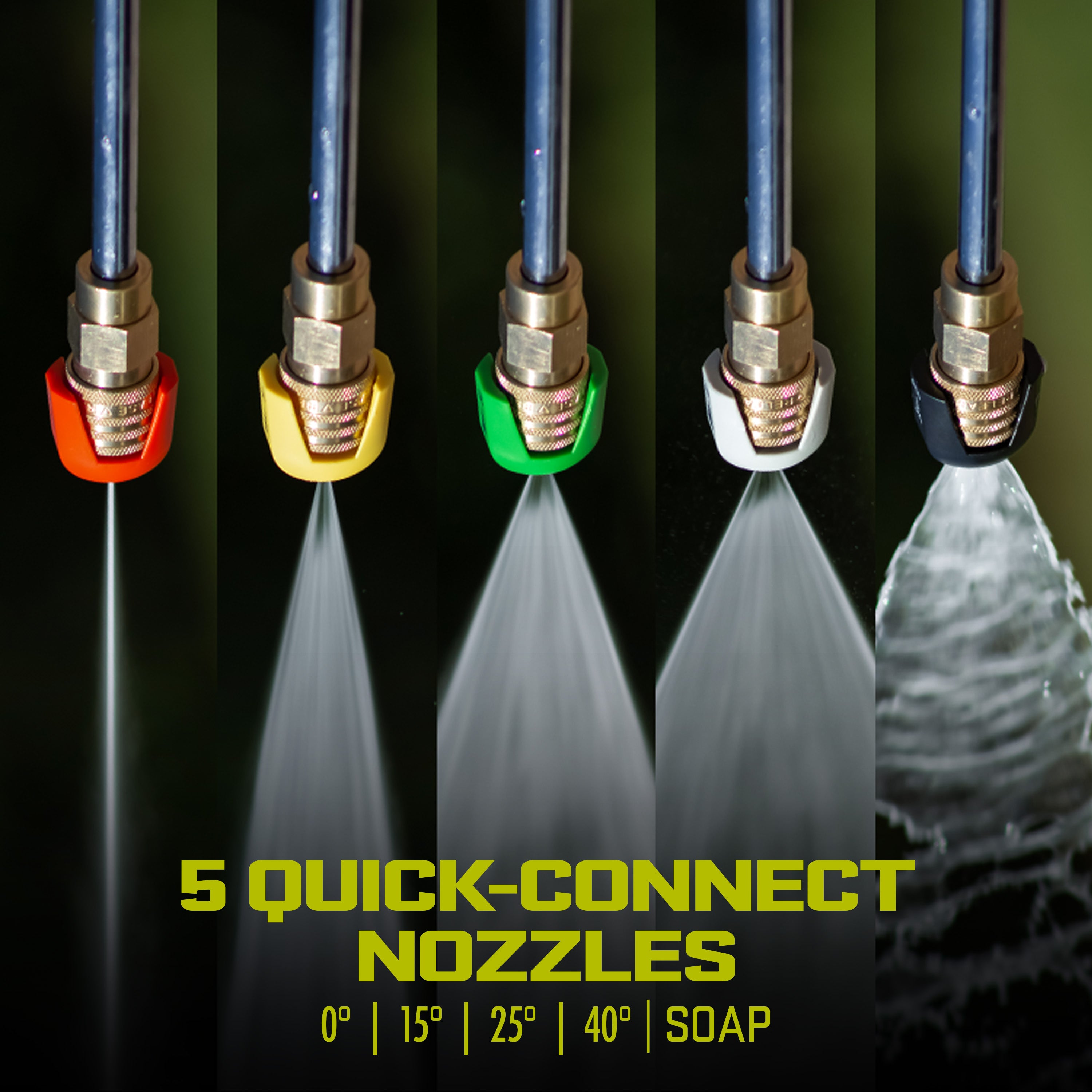 - 5 SPRAY TIPS: Quick-Connect nozzles (0º, 15º, 25º, 40º, Soap) for light to heavy-duty cleaning