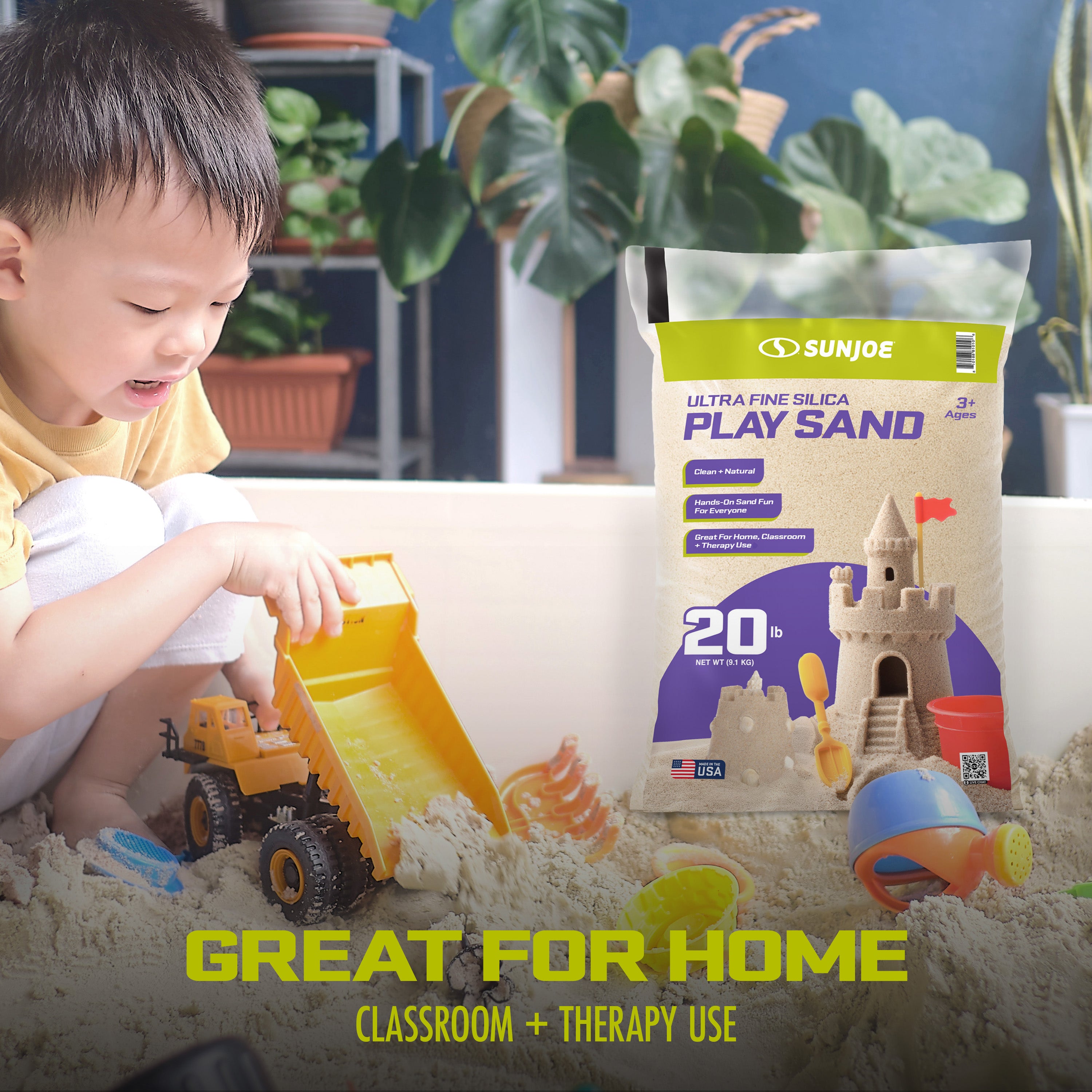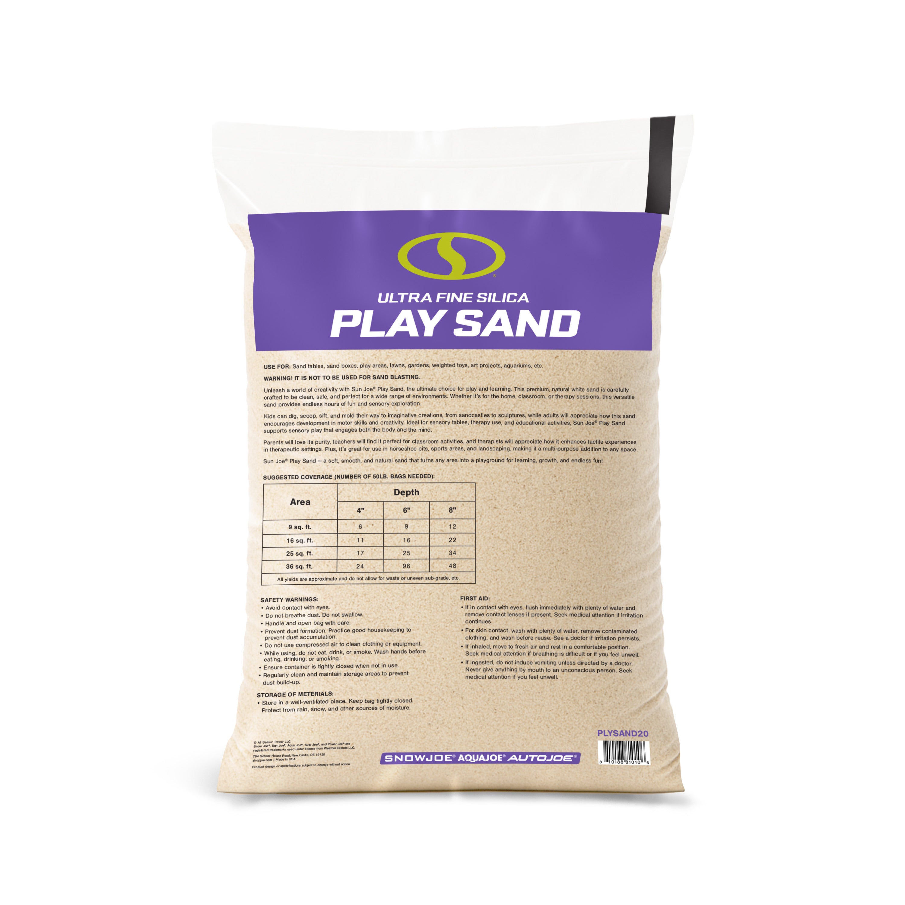 Unleash endless creativity and sensory fun with Sun Joe® PLYSAND20 Ultra Fine Silica Play Sand. This premium, natural white sand is ultra-clean, ultra-soft, and perfect for a variety of uses—from sandboxes, sensory tables, and therapy sessions to gardens, aquariums, and art projects. Specially crafted for safe play and learning, it’s ideal for both kids and adults, encouraging tactile development, motor skills, and imaginative exploration. Whether molding sandcastles, enhancing classroom activities, or creating calming therapy spaces, this 20 lb. bag of ultra-fine sand delivers smooth texture and versatility. Not for sandblasting use. Store in a dry, ventilated area to maintain purity. Turn any space into a playground for creativity and growth with Sun Joe® Play Sand.