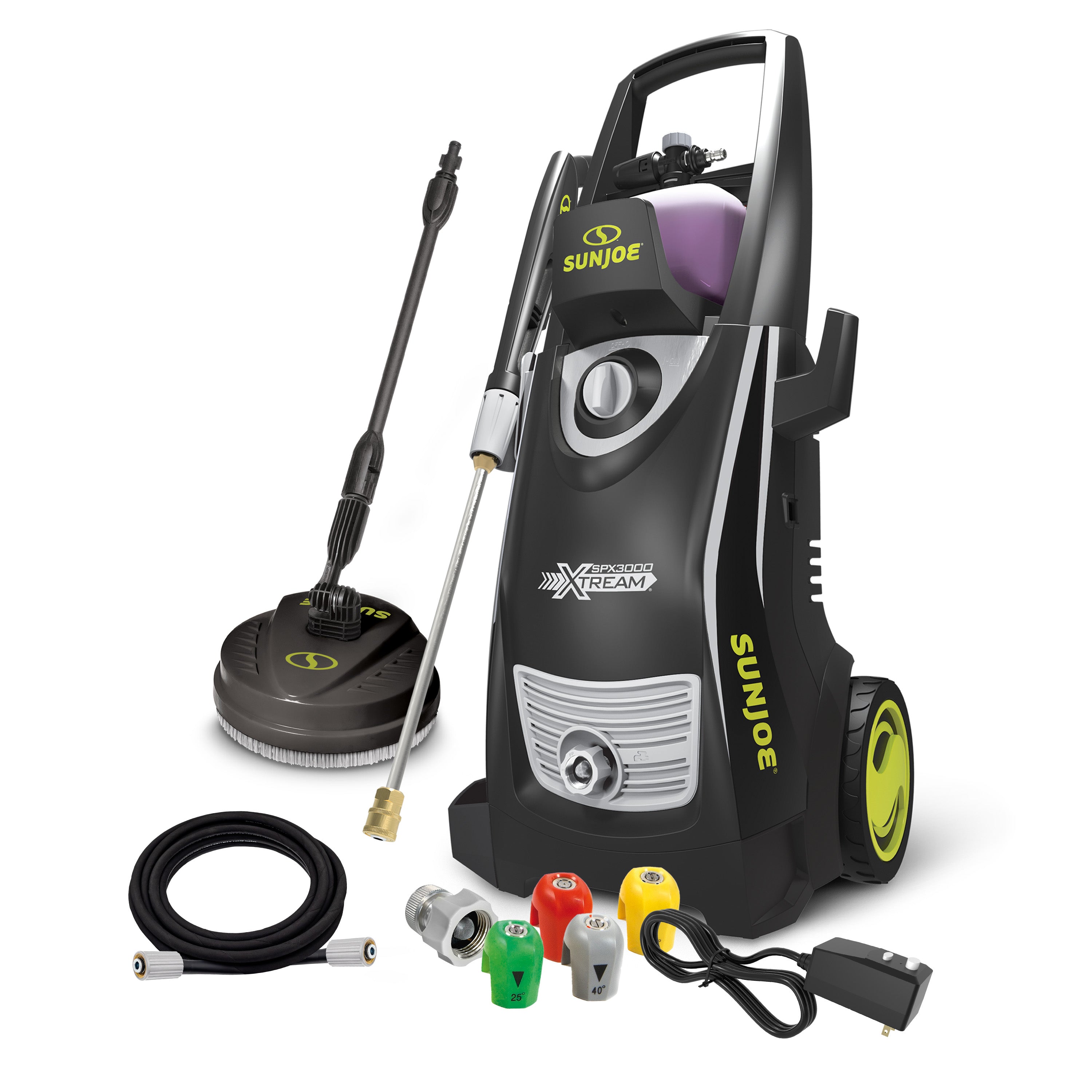 You Name It. You Aim It. Grime is Gone®. When grime gets the upper hand, fight back against your toughest home, outdoor and auto cleaning tasks with the SUN JOE® SPX3000® XTREAM. Combining gas-like power with the ease and convenience of electric, the Sun Joe XTREAM is made for those who demand the most from their machines. Its eco-friendly 13-amp motor packs a powerful punch, quickly generating up to 2200 pounds per square inch of pressure to break down and strip away dirt, grease and grime, and up to 1.1 gallons per minute of maximum flow to rinse away tough oil stains, mold, mildew, caked-on mud, rust, tar and other stubborn dirt and debris. Packed with a host of handy features, the Sun Joe XTREAM is primed to win the war on grime! It includes a rugged 20-foot, steel-reinforced, high-pressure hose and a durable stainless steel lance with solid brass fittings, the same quality construction you’d expect to find on commercial gas-powered pressure washers. It’s also equipped with a 35-ft power cord with GFCI protection and a handy onboard storage compartment to neatly store your accessories (sold separately). Plus, its exclusive TSS (TOTAL STOP SYSTEM) technology means the Sun Joe XTREAM, unlike gas-powered pressure washers that run loudly and continuously, automatically shuts off both pump and power when the trigger is not engaged to save energy, prolong pump life, and ensure quieter operation when not in use.
